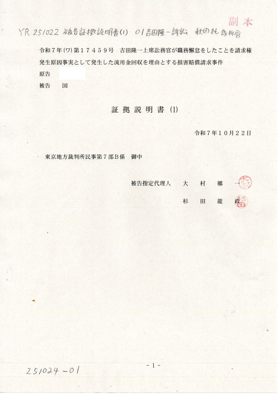 1 YR 251022 被告証拠説明書(1) 01吉田隆一訴訟 秋田純裁判官