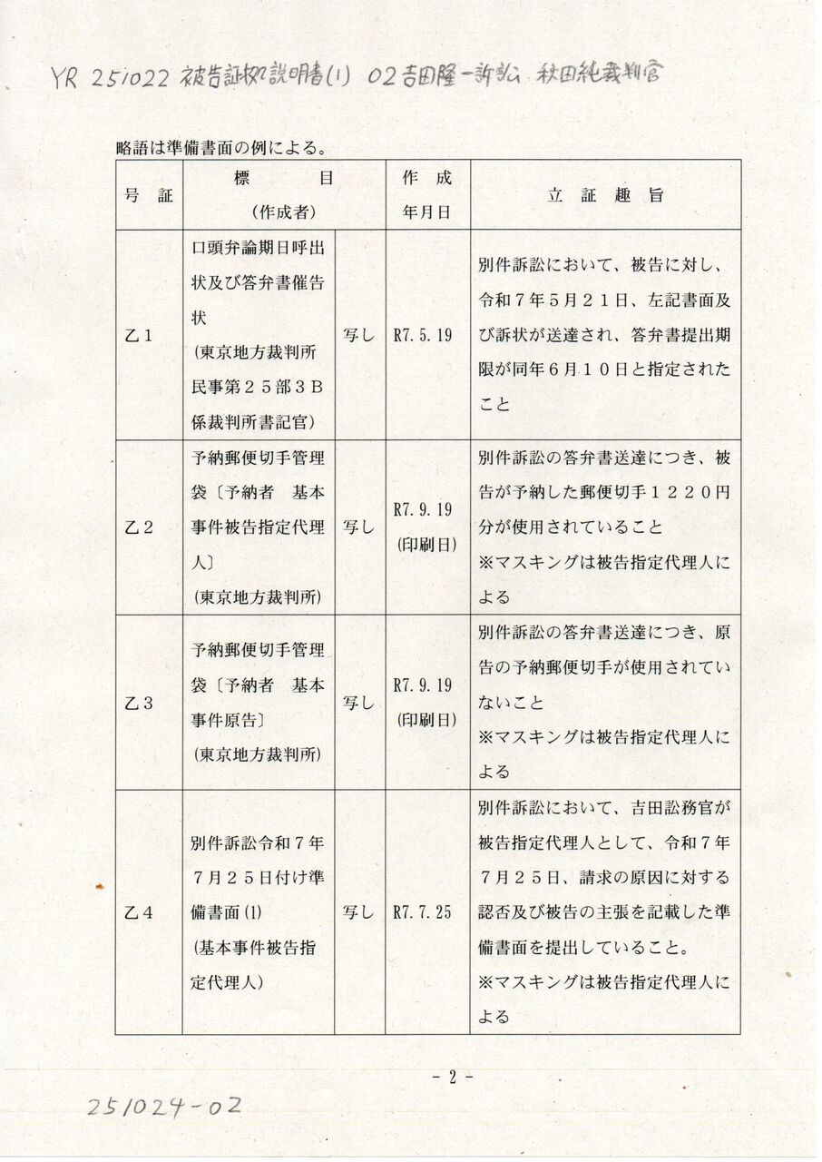 □ YR251022被告証拠説明書(1)吉田隆一訴訟<2p>