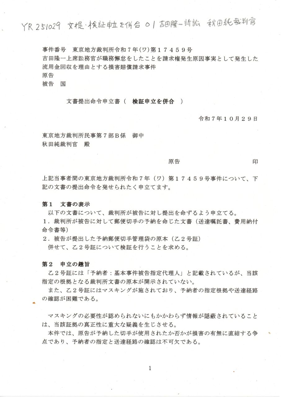 画像版 YR 251029 文書提出命令申立書(検証申立を併合) 吉田隆一訴訟 秋田純裁判官 大村郷一訟務支援専門官