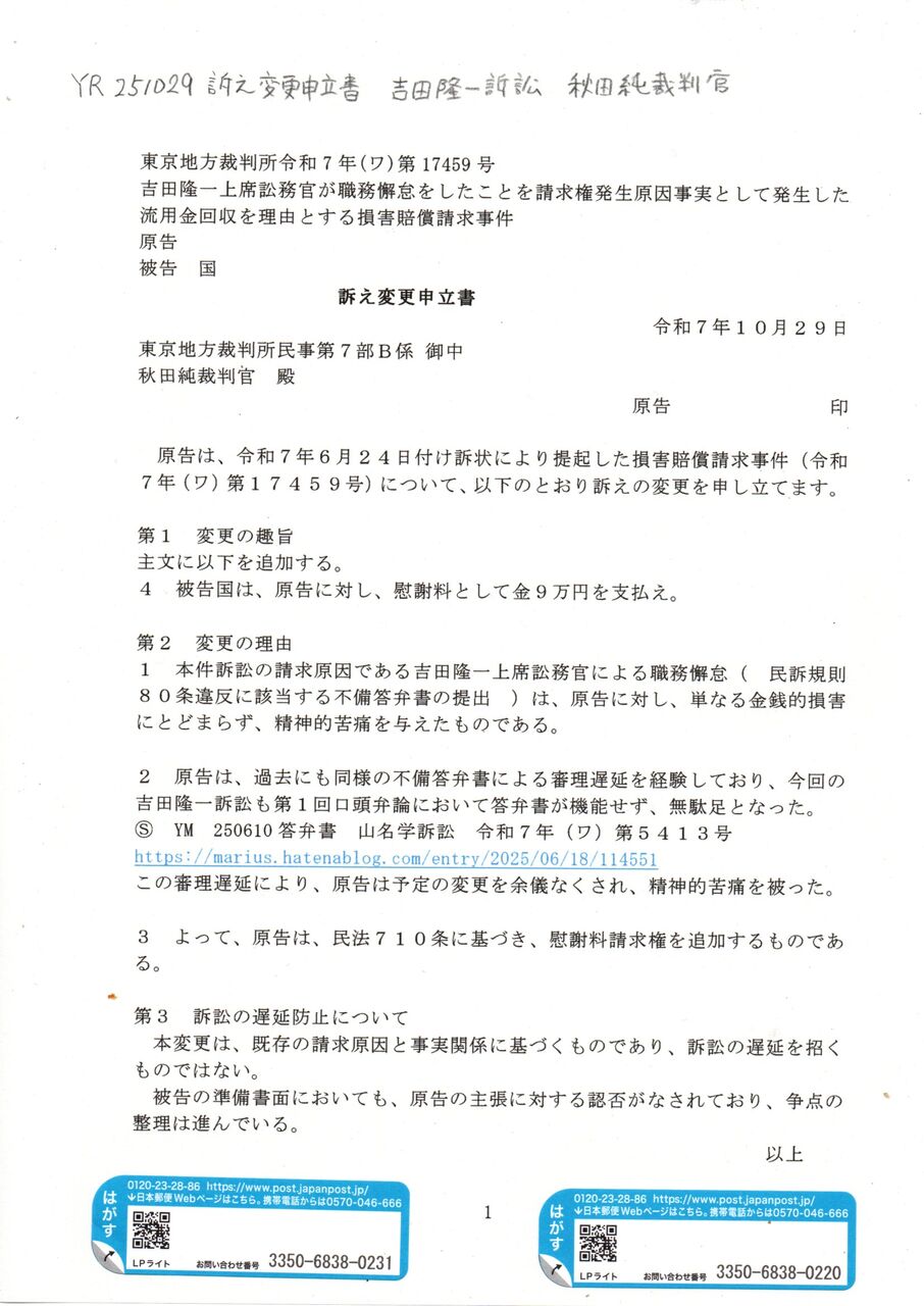 画像版 YR 251029 訴え変更申立書 吉田隆一訴訟 秋田純裁判官 大村郷一訟務支援専門官
