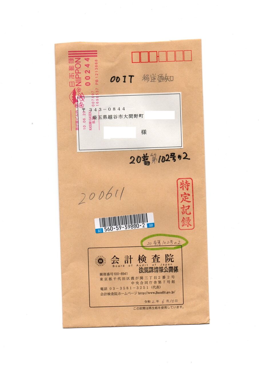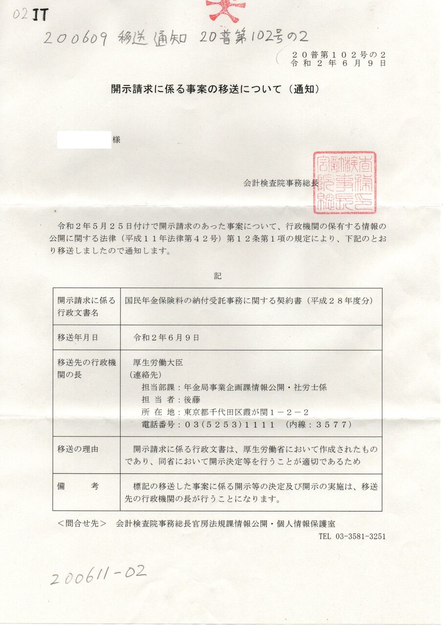 画像版 IT 200609 移送通知 会計検査院 から 厚労省に #加藤勝信厚生労働大臣 20普第102号の2令和2年6月9日 #契約書の表紙
