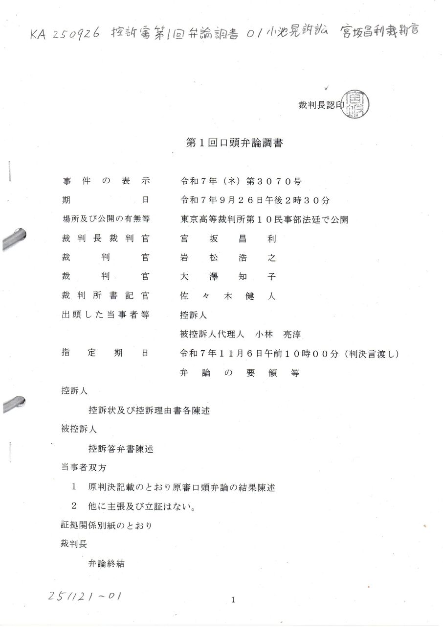 1 KA 250926 控訴審第1回期日調書 01小池晃訴訟