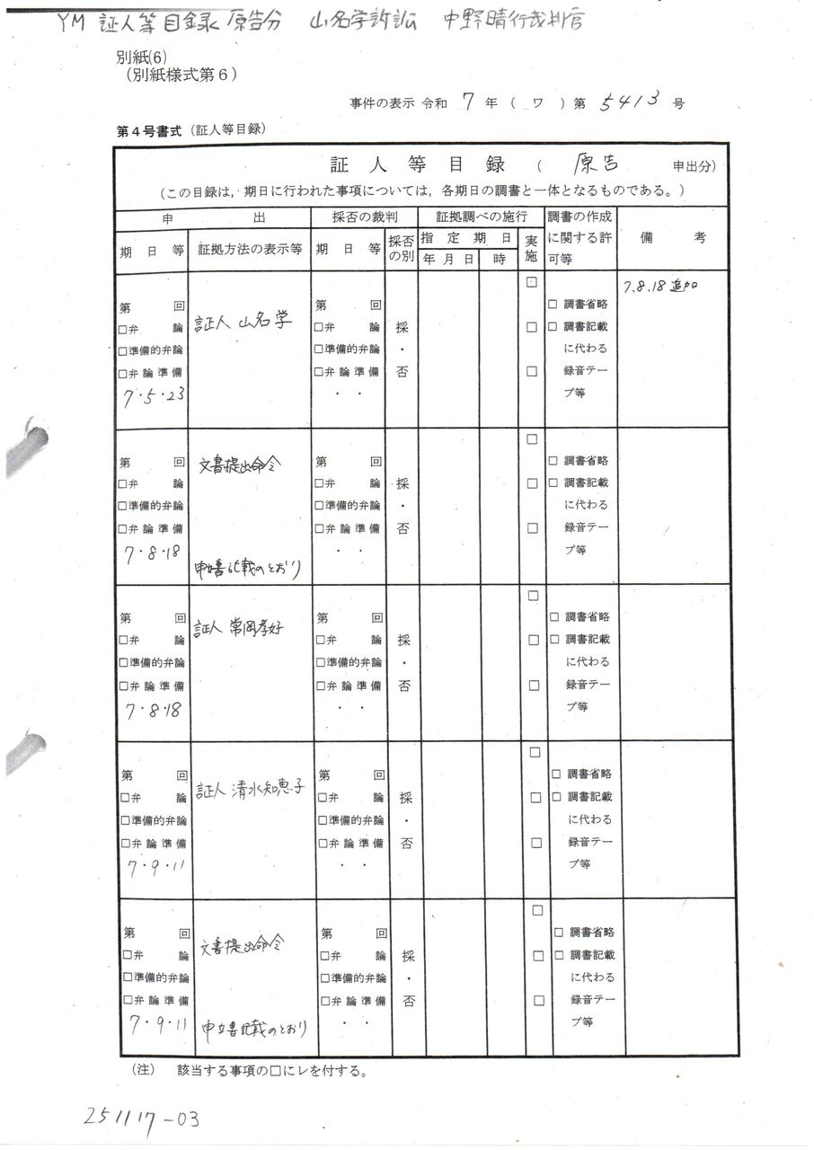 3 YM 証人等目録原告分 中野晴行裁判官 山名学訴訟