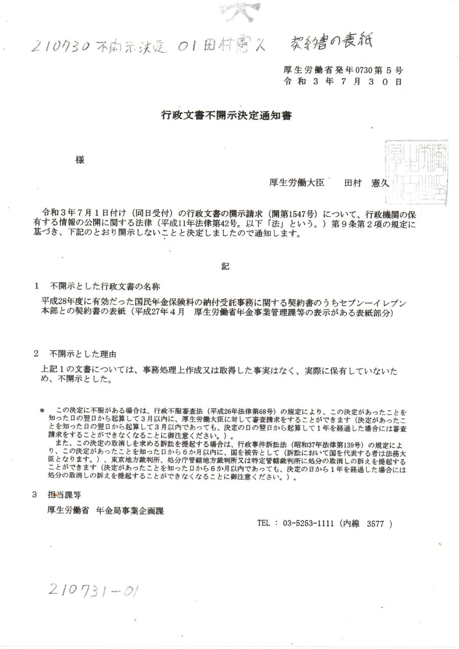 0 YM 令和7年4月 表紙無し 210730不開示決定 田村憲久厚労大臣