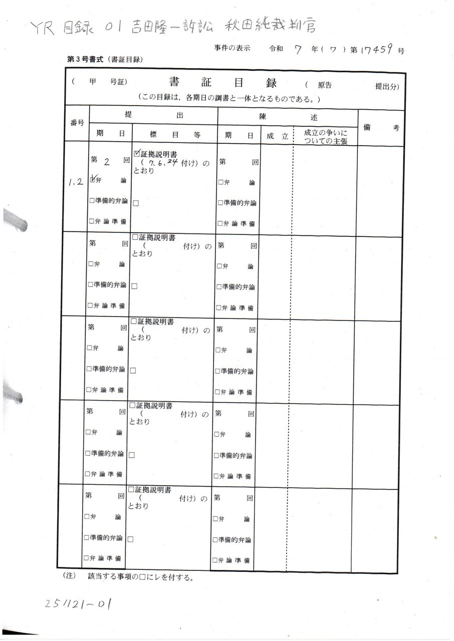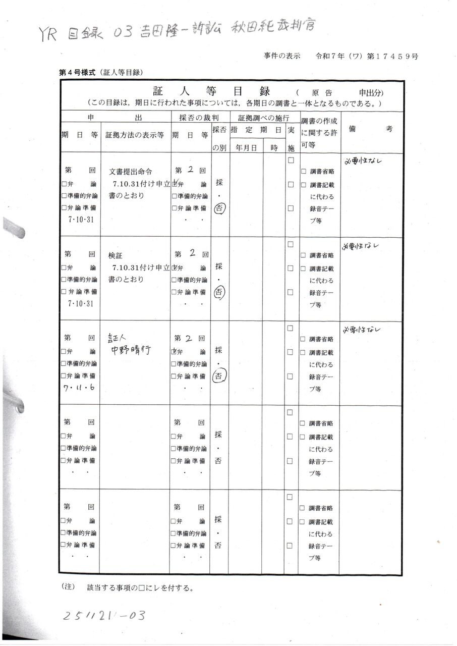 Ⓢ YR 251029 文書提出命令・検証付き 吉田隆一訴訟