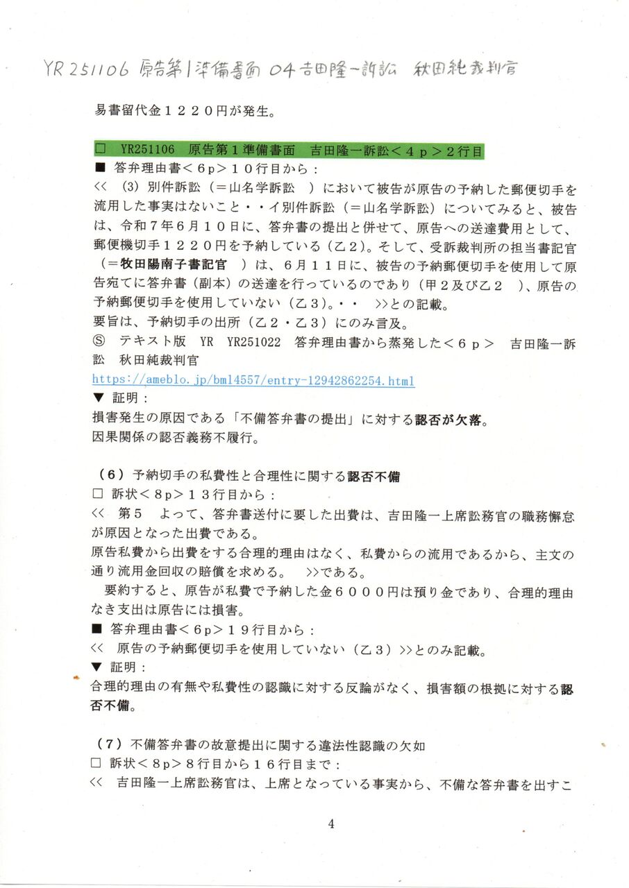 4 YR 251106 原告第1準備書面 04吉田隆一訴訟 秋田純裁判官