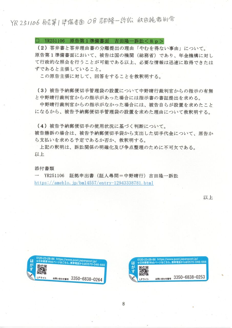 8 YR 251106 原告第1準備書面 08吉田隆一訴訟 秋田純裁判官