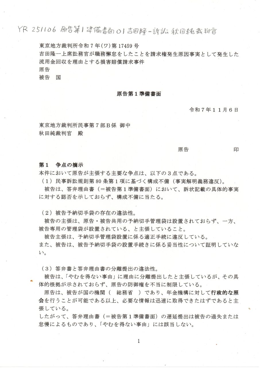 Ⓢ 送付版 YR 251106 原告第1準備書面 吉田隆一訴訟 秋田純裁判官