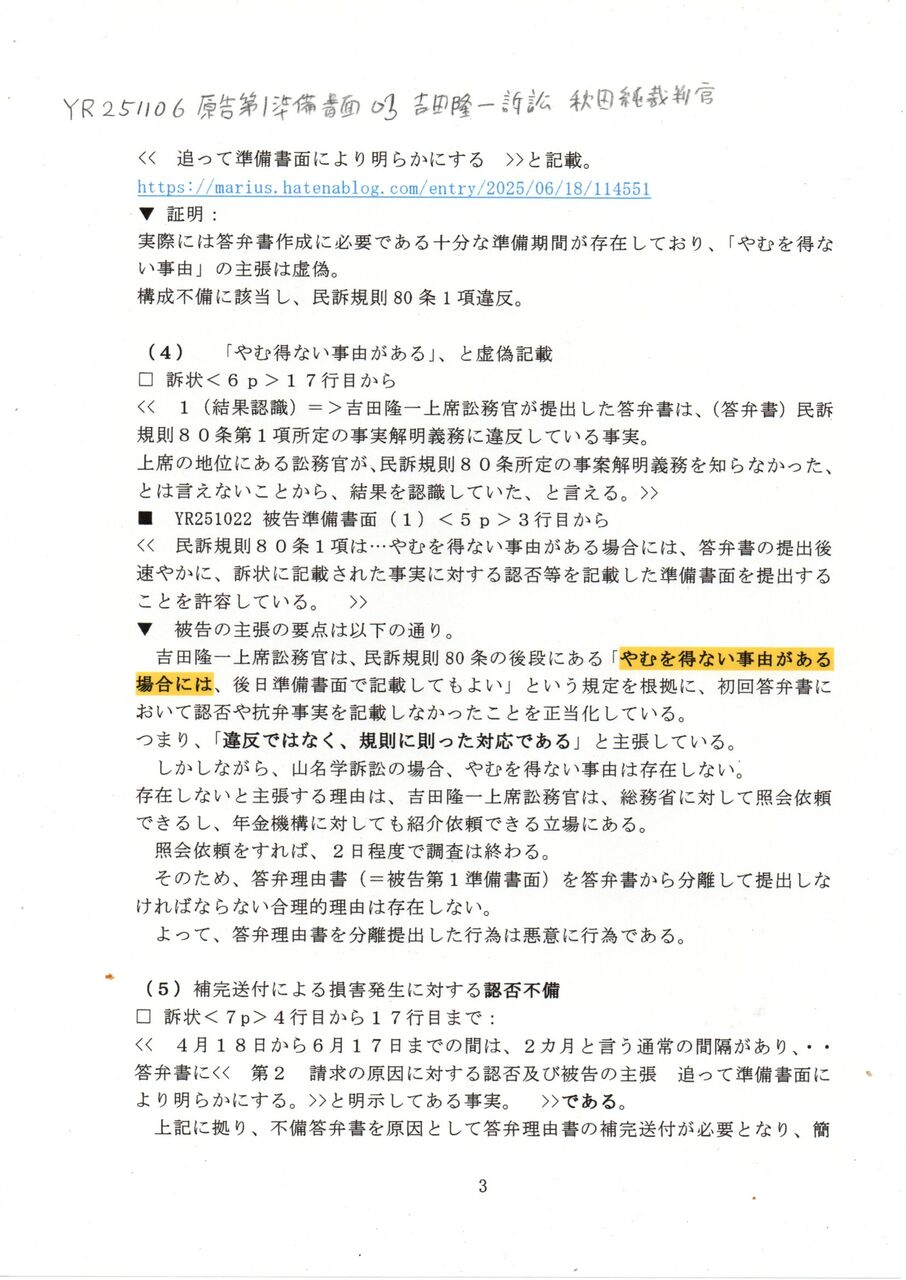 3 YR 251106 原告第1準備書面 03吉田隆一訴訟 秋田純裁判官