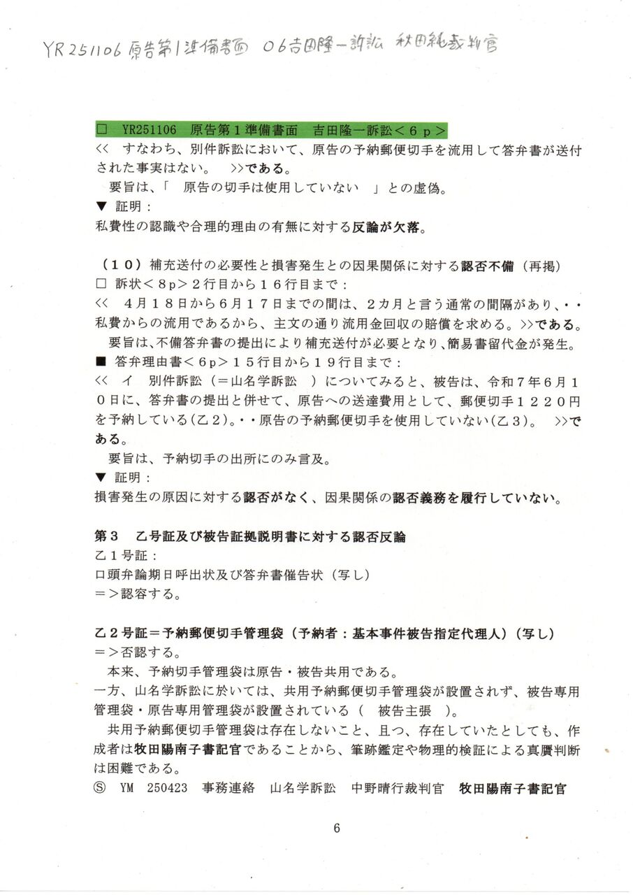 << イ 別件訴訟(=山名学訴訟 )についてみると、被告は、令和7年6月10日に、答弁書の提出と併せて、原告への送達費用として、郵便切手1220円を予納している(乙2)。・・原告の予納郵便切手を使用していない(乙3)。 >>である。