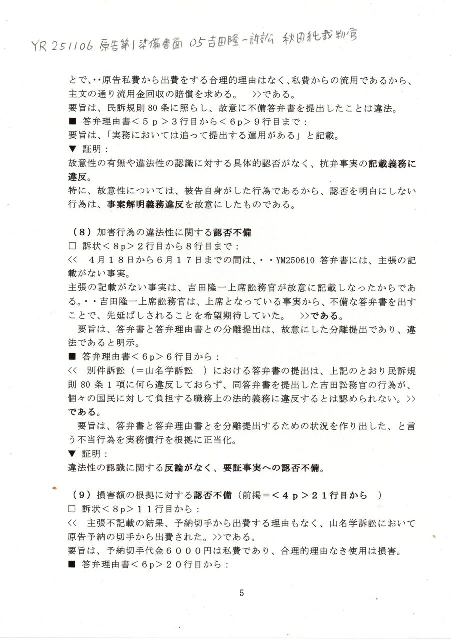 5 YR 251106 原告第1準備書面 05吉田隆一訴訟 秋田純裁判官