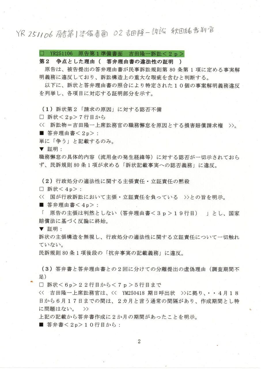 2 YR 251106 原告第1準備書面 02吉田隆一訴訟 秋田純裁判官