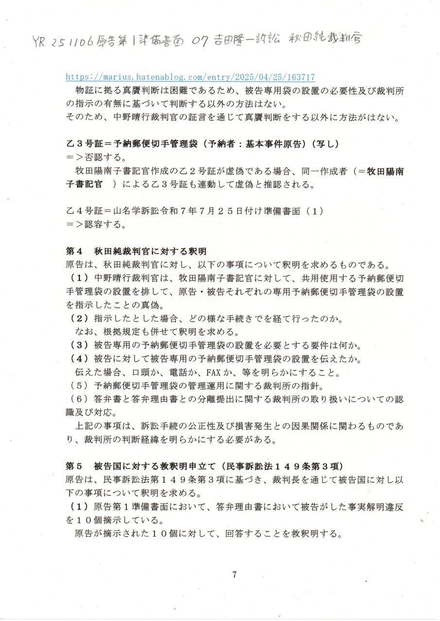 7 YR 251106 原告第1準備書面 07吉田隆一訴訟 秋田純裁判官