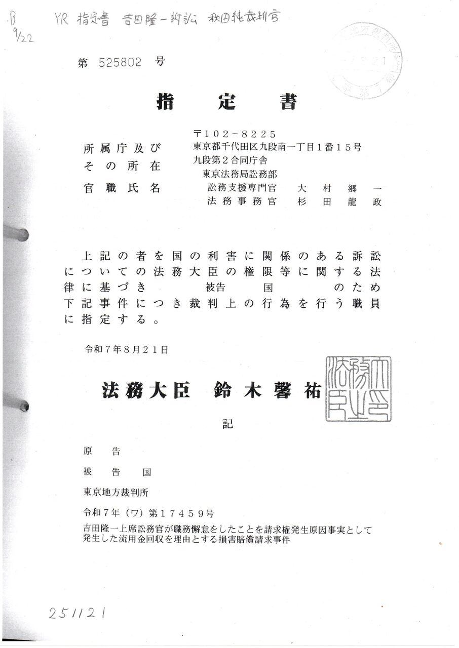 4 YR 指定書 吉田隆一訴訟 大村郷一訟務支援専門官