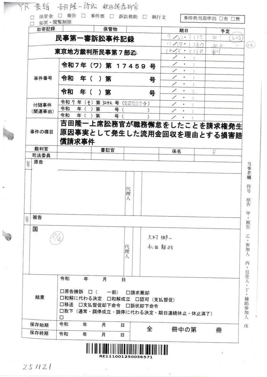 画像版 YR 表紙・切手管理袋・指定書 吉田隆一訴訟 秋田純裁判官