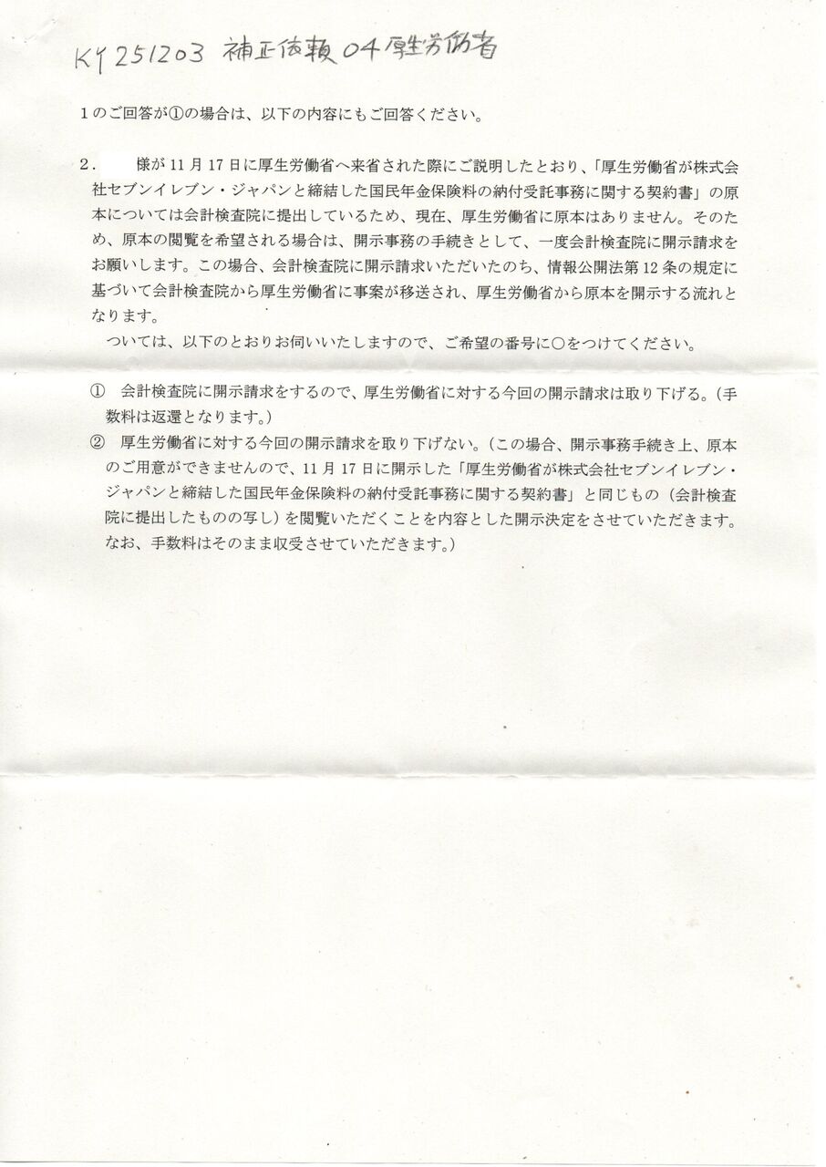 2.上原様が11月17日に厚生労働省来省された際にご説明したとおり、「厚生労働省が株式会社セプンイレプン・ジャパンと締結した国民年金保険料の納付受託事務に関する契約書」の原本については会計検査院に提出しているため、現在、厚生労働省に原本はありません。