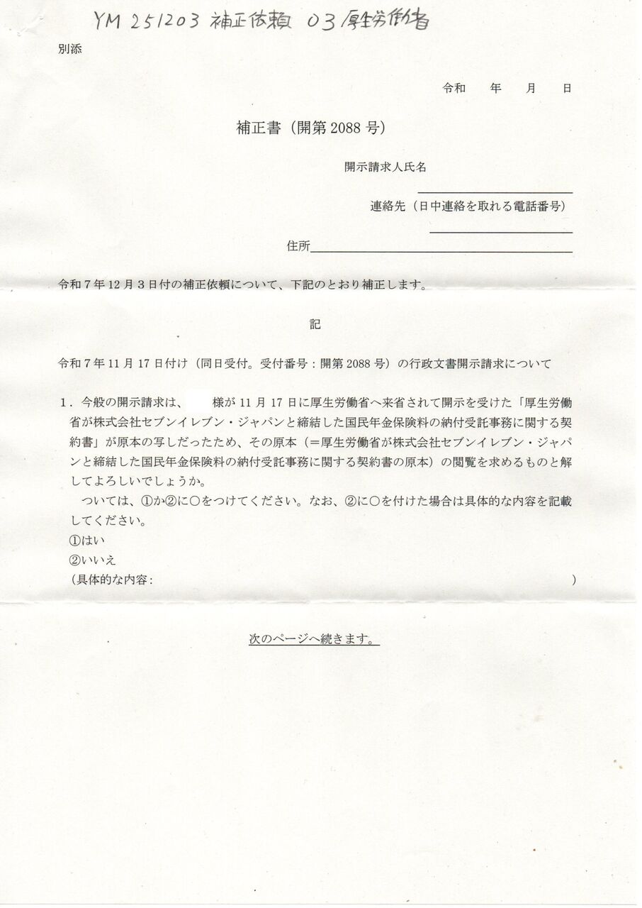 1.今般の開示請求は、上原様が11月17日に厚生労働省へ来省されて開示を受けた「厚生労働省が株式会社セプンイレプン・ジャパンと締結した国民年金保険料の納付受託事務に関する契約書」が原本の写しだったため、その原本(=厚生労働省が株式会社セプンイレプン・ジャパンと締結した国民年金保険料の納付受託事務に関する契約書の原本)の閲覧を求めるものと解してよろしいでしようか。