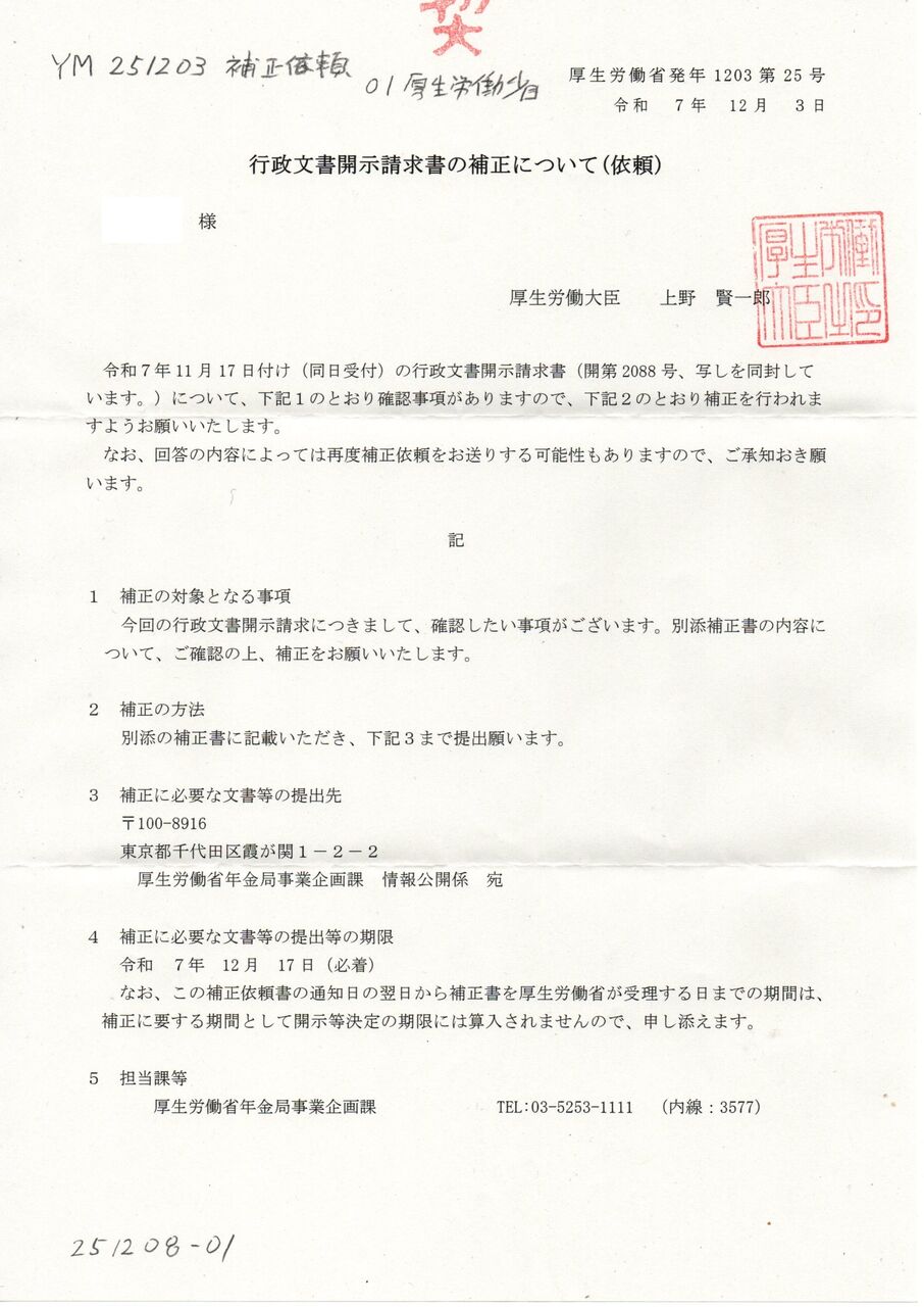 画像版 YM 251203 補正依頼 厚生労働省から 上野賢一郎議員
