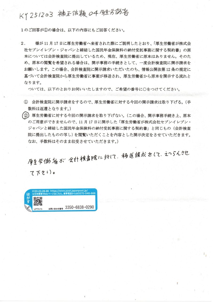 ② 厚生労働省に対する今回の開示請求を取り下げない。(この場合、開示事務手続き上、原本のご用意かできませんので、11月17日に開示した「厚生労働省が株式会社セプンイレプン・ジャパンと締結した国民年金保険料の納付受託事務に関する契約書」と同じもの(会計検査院に提出したものの写し)を閲覧いただくことを内容とした開示決定をさせていただきます。