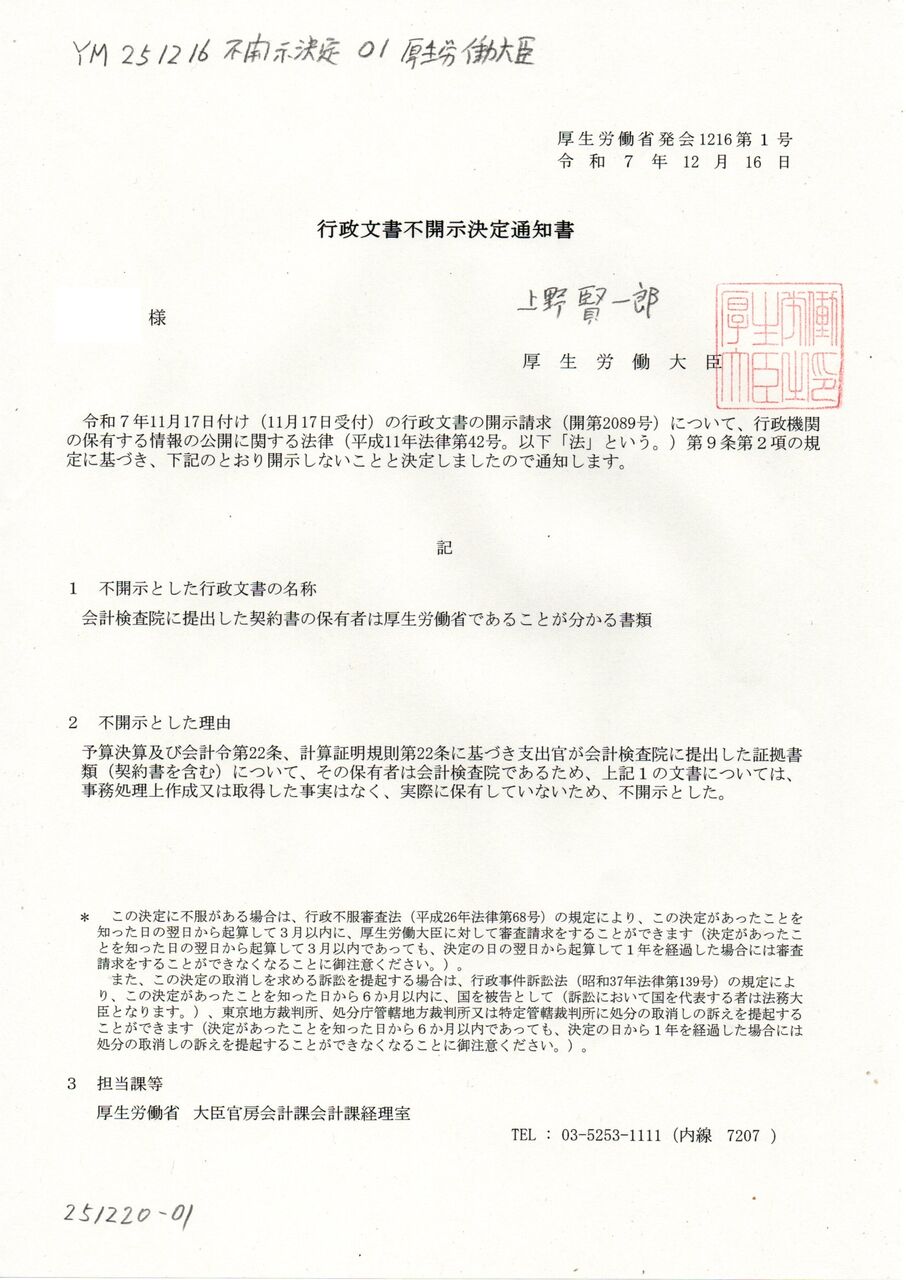 画像版 YM 251216 不開示決定 保有者 上野賢一郎議員 厚労省