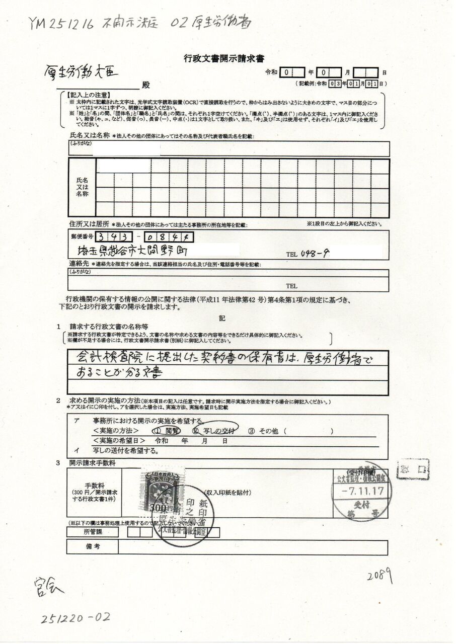 会計検査院に提出した契約書の保有者は厚生労働省であることが分かる書類