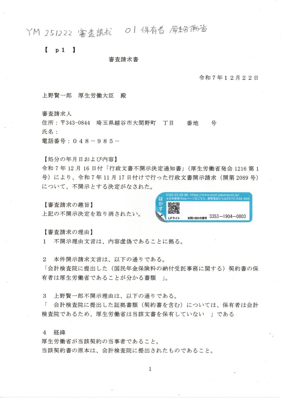 画像版 YM 251222 審査請求書 保有者 厚生労働省 上野賢一郎議員