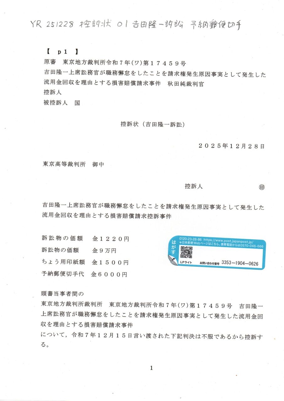 1 YR 251228 控訴状 01吉田隆一訴訟