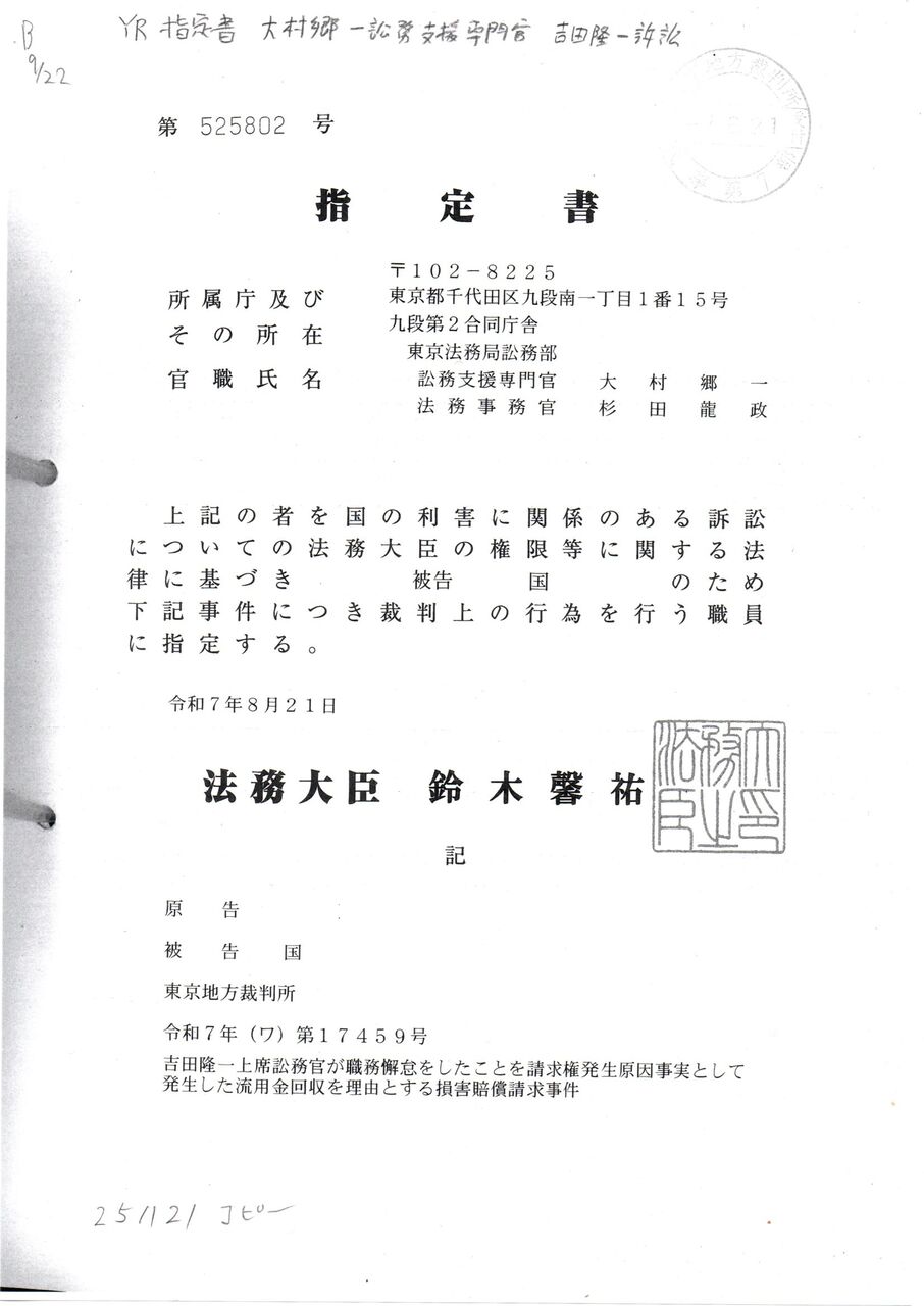 画像版 YR 指定書と標題 吉田隆一訴訟 秋田純裁判官 大村郷一訟務支援専門官